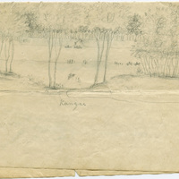 Drawing by Pherne Brown Pringle, the daughter of Tabitha Moffatt Brown, the 'Mother of Oregon.' This sketch features a river crossing in Kansas during her family's journey on the Oregon Trail. Copies of later drawings were accompanied in an album by journal entries of Pherne's husband, Virgil K. Pringle.