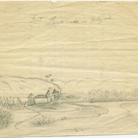 Drawing by Pherne Brown Pringle, the daughter of Tabitha Moffatt Brown, the 'Mother of Oregon.' This sketch features Fort Laramie in Wyoming during her family's journey on the Oregon Trail. Copies of later drawings were accompanied in an album by journal entries of Pherne's husband, Virgil K. Pringle.