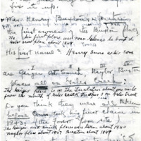 Answers from Ernest Clark Brown in response to questions from his sister, Liberta Brown Schoch. Ernest discusses the land claims of the Buxton, Geiger, Smith, and Naylor families, as well as details of Orus Brown's life.