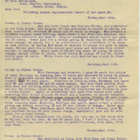 Portland, Ore. Oct 2nd, 1899<br/>Dr Thos McClelland,<br/>Pres. Pacific University.<br/>Forest Grove, Oregon.<br/>Dear Sir:<br/>Following please supplementary report of our agent #1.<br/>Friday, Sept 15th.<br/>To-day in Forest Grove:<br/>Man who sold liquor was Charles Miller, the proprietor of the drug store. Lot Langley the man described in report in paying for beer tendered $1 received 50 cents and 25 cents in change. Was present a hardware drummer named McCLung, Lewis Gower a San Francisco Examiner subsoription solicitor and myself. Langley purchased second bottle and gave 25 cents. Gower paid for a bottle giving $1 receiving 50 cents and 25 cents change. On paying for it he asked Miller the proprietor if he wanted some silver, having $10 which he desired to change for gold or paper dollars in exchange. Money paid to Miller for beer: 50 cents, 25 cents change, second bottle 25 cents, third bottle $1 change 50 cents and 25 cents, fourth bottle gave 25 cents. While there the slot machine was played by Gower and myself.<br/>Saturday, Sept 16th.<br/>To-day in Forest Grove:<br/>With Kerrigan and Anderson I gave 25 cents for bottle of beer. Kerrigan in treating gave 50 cents and received 25 cents in change. Fred or sometimes called Hanley Kane in paying for the bottle drank by himself and 25 cent piece. Anderson on treating Kane, Kerrigan and agent paid $1 and received 50 and 25 cents change, Man described shaking dice with Kane and inviting Anderson, Kerrigan and agent to drink, gave a quarter for the bottle, later on paying for the blackberry and whiskey he gave a silver dollar.Agent in purchasing beer gave five dollar gold piece receiving four silver dollars 50 cents and a quarter, on second occasion 25 cent piece, third 50 cent piece change 25 cents, fourth, 25 cent piece.<br/>When Wirtz came in he paid $1 received change 50 and 25 cent pieces while treating Kane, Anderson, Kerrigan and agent. Again bough a bottle giving one dollar receiving 50 and 25 cent pieces in change. Later gave 25 cent piece. When insurance agent Staley arrived he treated, gave $1 and received 50 and 25 cent pieces change, immediately gave the 25 cent piece for another bottle.<br/>During these transactions the clerk, the only man in the store with Mr Miller, sold the beer. He was 22 years old, 5 feet 8 inches, 150 lbs, smooth face, long black hair parted in middle forehead, blue eyes, first name Fred.<br/>Sunday, Sept. 17th.<br/>To-day in Forest Grove:<br/>Man described as being with Fred Kane was Judge Dolstrum. Agent in buying beer tendered first $1 received 50 and 25 cent pieces in change. Second time, 25 cent piece, third, 50 cents receiving 25 cents change. Kane received the money in the absence of the clerk in the front part of the store. He reciprocated the treat twice.<br/>Monday, Sept 18th<br/>To-day in Forest Grove:<br/>With W.H.Sears, agent gave drug clerk a quarter for bottle of beer. Sears in reciprocating gave 50 cents, received 25 cents in change. On Jack Roys arrival Agent paid $1, change 50 and 25 cent pieces. Clerk having returned to front of store Mr Roy got another bottle but could not open it not understanding hot to operate cork screw. Clerk came back on being called and pulled the cork and received silver dollar from Roy and returned 50 and 25 cent pieces in change. Roy shortly after purchased another bottle to drink with agent and Sears and one to take home paying a 50 cent piece.<br/>Emmett Iwick drinking with Ballcrow gave 50 cents and received change 25 cents. Later Iwick gave 25 cents for a bottle for Sears and agent. Operative with Theo Wirtz changed $5 gold piece receiving in change one silver dollar, seven half dollars and 25 cent piece. For a second bottle with Wirtz gave the 25 cents. Kane with Si Clark and agent gave 50 cent piece and received 25 cents in change. Clark gave $1 in silver received 50 and 25 cent pieces in change. Agent gave 50 cents received 25 cents change. Kane second treat gave quarter, third time, $ 1 received change 50 and 25 cent pieces. Agents second treat gave 25 cents, third gave 50 cents change and fourth 25 cents. Clerk on all these occasions took money.<br/>Wednesday, Sept 20th<br/>To-day in Forest Grove:<br/>Man described drinking with John the wagon maker in payment gave 25 cents. Agent treating the two gave $5 gold piece received change 4 silver dollars, 50 and 25 cent pieces. Miller received money. <br/>The former druggist mentioned in report was 35 years old, 5 feet 8 inches, 145 lbs, brown hair and mustache, florid complexion.<br/>Yours respectfully,
