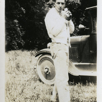 - A photograph of a male Pacific University student. He is dressed in a suit, standing next to a car that is parked on the grass. This photograph appears in an album that was compiled by Edith Hansen McGill, a 1930 Pacific University graduate.