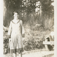 - A photograph of a female Pacific University student standing on a dirt road. She appears to be near a forested area. A car is partially visible behind her. This photograph appears in an album that was compiled by Edith Hansen McGill, a 1930 Pacific University graduate.