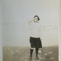 - A photograph of a female Pacific University student standing on the beach. The ocean is visible behind her. This photograph was probably taken on the Oregon coast. This photograph appears in an album that was compiled by Edith Hansen McGill, a 1930 Pacific University graduate.