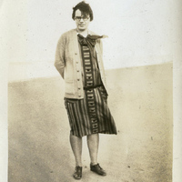 A photograph of a female Pacific University student posing on the beach. She could possibly be part of the Y.W.C.A. or Young Women's Christian Association. The Y.W.C.A. was founded in Portland in 1907. Forest Grove would eventually have their own branch at Pacific University. Young woman would often travel together to the beach with their Y.W.C.A. group. This photograph appears in an album that was compiled by Edith Hansen McGill, a 1930 Pacific University graduate.