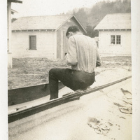 - A photograph of a male Pacific University student sitting on a pile of sand. This photograph appears in an album that was compiled by Edith Hansen McGill, a 1930 Pacific University graduate.