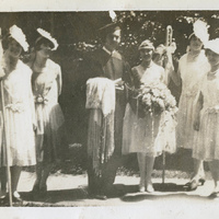 A photograph of the May Day queen, Florence Bennet, and her court in May, 1928. The members of her court are identified as Dorothy Wood, Lillian Thouvenel, Florence Riffle, Shellie Slyter, Alice Montgomery and Jacqueline Honeywell. This photograph appears in an album that was compiled by Edith Hansen McGill, a 1930 Pacific University graduate.