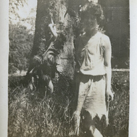 A photograph of two Pacific University women students dressed up for a play during the May Day celebration. The students performed the play The Joy of Morning. The May Day celebration tradition at Pacific University began in 1914, and would continue for over 50 years. A student would be crowned 'Queen of the May'. The event would often include a double-line procession from the Carnegie Library to the west side of Marsh Hall. A luncheon, singing, athletic competitions and other activities would be enjoyed by students and members of the Forest Grove community. A maypole would be erected and young ladies dressed in white would wind ribbon around it. This photograph appears in an album that was compiled by Edith Hansen McGill, a 1930 Pacific University graduate.