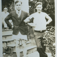 A photograph of two male Pacific University students dressed comically. One has a suit jacket and boxer short. The other has on slacks and a tank top and he has a pipe in his mouth. Another student sits behind the pair laughing. This photograph appears in an album that was compiled by Edith Hansen McGill, a 1930 Pacific University graduate.