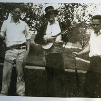 A photograph of three male Pacific University students dressed up in costumes for an unknown event. Two men have guns and holsters, while the third is wearing a sombrero and holding a guitar. It was probably for the Senior Breakfast that was held at the faculty cabin in October, 1928. The seniors brought Boxer along and invited a few underclassman in hopes of igniting the Boxer spirit at Pacific again. There was a minor scuffle over the mascot, however the senior class maintained possession of Boxer. He was hidden away again after the breakfast. This photograph appears in an album that was compiled by Edith Hansen McGill, a 1930 Pacific University graduate.