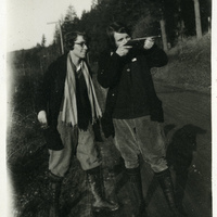 - A photograph of two Pacific University students on a dirt road. One student is aiming a gun. Both are wearing knickerbocker style pants with tall boots. This photograph appears in an album that was compiled by Edith Hansen McGill, a 1930 Pacific University graduate.