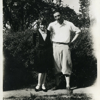 - A photograph of two Pacific University students standing on a sidewalk. This photograph appears in an album that was compiled by Edith Hansen McGill, a 1930 Pacific University graduate.