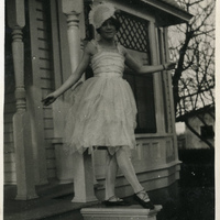 A photograph of a female Pacific University student dressed up in a ballerina style outfit. She was most likely dressed up for the May Day Celebration. The May Day celebration tradition at Pacific University began in 1914, and would continue for over 50 years. A student would be crowned 'Queen of the May'. The event would often include a double-line procession from the Carnegie Library to the west side of Marsh Hall. A luncheon, singing, athletic competitions and other activities would be enjoyed by students and members of the Forest Grove community. A maypole would be erected and young ladies dressed in white would wind ribbon around it. This photograph appears in an album that was compiled by Edith Hansen McGill, a 1930 Pacific University graduate.