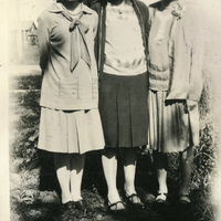 - A photograph of three female Pacific University students posing in front of a tree. This photograph appears in an album that was compiled by Edith Hansen McGill, a 1930 Pacific University graduate.