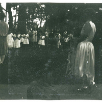 A photograph of the Pacific University May Day Celebration procession. A large Maypole is visible in the background. The May Day celebration tradition at Pacific University began in 1914, and would continue for over 50 years. A student would be crowned 'Queen of the May'. The event would often include a double-line procession from the Carnegie Library to the west side of Marsh Hall. A luncheon, singing, athletic competitions and other activities would be enjoyed by students and members of the Forest Grove community. A maypole would be erected and young ladies dressed in white would wind ribbon around it. This photograph appears in an album that was compiled by Edith Hansen McGill, a 1930 Pacific University graduate.