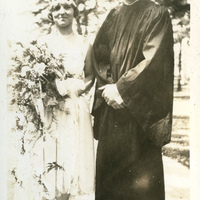 A photograph of the 1928 Pacific University May Day Queen, Florence Bennet. The May Day celebration tradition at Pacific University began in 1914, and would continue for over 50 years. A student would be crowned 'Queen of the May'. The event would often include a double-line procession from the Carnegie Library to the west side of Marsh Hall. A luncheon, singing, athletic competitions and other activities would be enjoyed by students and members of the Forest Grove community. A maypole would be erected and young ladies dressed in white would wind ribbon around it. This photograph appears in an album that was compiled by Edith Hansen McGill, a 1930 Pacific University graduate.