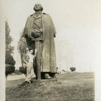 - A photograph of a Pacific University student leaning on a large statue. This photograph appears in an album that was compiled by Edith Hansen McGill, a 1930 Pacific University graduate.