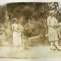 A photograph of the 1928 Pacific University May Day Celebration procession. The photograph features the May Day Queen, Florence Bennet. The May Day celebration tradition at Pacific University began in 1914, and would continue for over 50 years. A student would be crowned 'Queen of the May'. The event would often include a double-line procession from the Carnegie Library to the west side of Marsh Hall. A luncheon, singing, athletic competitions and other activities would be enjoyed by students and members of the Forest Grove community. A maypole would be erected and young ladies dressed in white would wind ribbon around it. This photograph appears in an album that was compiled by Edith Hansen McGill, a 1930 Pacific University graduate.