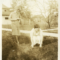 - A photograph of two female Pacific University students playing around on some grass. This photograph appears in an album that was compiled by Edith Hansen McGill, a 1930 Pacific University graduate.