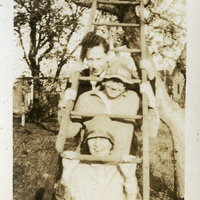 - A photograph of three Pacific University students posing with their heads between the rungs of a ladder. This photograph appears in an album that was compiled by Edith Hansen McGill, a 1930 Pacific University graduate.