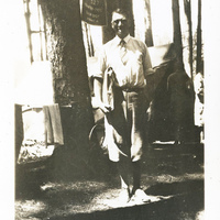 A photograph of a man wearing knickerbocker style pants. He is at an Epworth League campout. The Epworth League was founded by Methodists in 1889 for young adults ages 18-35. Activities often included camping. There were several campgrounds in Oregon and Washington for different chapters of the Epworth League to enjoy. This photograph appears in an album that was compiled by Edith Hansen McGill, a 1930 Pacific University graduate.