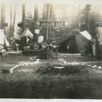A photograph of the Jason Lee United Methodist Church camp during an Epworth League campout. The Epworth League was founded by Methodists in 1889 for young adults ages 18-35. Activities often included camping. There were several campgrounds in Oregon and Washington for different chapters of the Epworth League to enjoy. This photograph appears in an album that was compiled by Edith Hansen McGill, a 1930 Pacific University graduate.