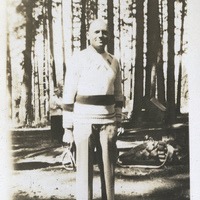 A photograph of a man during an Epworth League camping trip. The Epworth League was founded by Methodists in 1889 for young adults ages 18-35. Activities often included camping. There were several campgrounds in Oregon and Washington for different chapters of the Epworth League to enjoy. This photograph appears in an album that was compiled by Edith Hansen McGill, a 1930 Pacific University graduate.