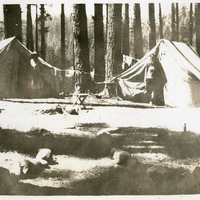 A photograph of two tents at a campsite. Two people are next to the tents. It is possibly an Epworth League camping trip. The Epworth League was founded by Methodists in 1889 for young adults ages 18-35. Activities often included camping. There were several campgrounds in Oregon and Washington for different chapters of the Epworth League to enjoy. This photograph appears in an album that was compiled by Edith Hansen McGill, a 1930 Pacific University graduate.