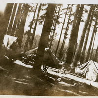 A photograph of three tents at a campsite. It is possibly an Epworth League camping trip. The Epworth League was founded by Methodists in 1889 for young adults ages 18-35. Activities often included camping. There were several campgrounds in Oregon and Washington for different chapters of the Epworth League to enjoy. This photograph appears in an album that was compiled by Edith Hansen McGill, a 1930 Pacific University graduate.
