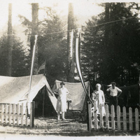 A photograph of the McMinnville chapter of the Epworth League's campsite. The Epworth League was founded by Methodists in 1889 for young adults ages 18-35. Activities often included camping. There were several campgrounds in Oregon and Washington for different chapters of the Epworth League to enjoy. This photograph appears in an album that was compiled by Edith Hansen McGill, a 1930 Pacific University graduate.