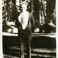 A photograph of a man posing in the woods with a campsite full of tents behind him. This was probably taken during an Epworth League campout. The Epworth League was founded by Methodists in 1889 for young adults ages 18-35. Activities often included camping. There were several campgrounds in Oregon and Washington for different chapters of the Epworth League to enjoy. This photograph appears in an album that was compiled by Edith Hansen McGill, a 1930 Pacific University graduate.