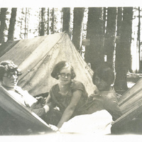 A photograph of Pacific University student, Edith Hansen McGill, with two fellow students in a hammock. There is a tent in the background. This was probably taken during an Epworth League campout. The Epworth League was founded by Methodists in 1889 for young adults ages 18-35. Activities often included camping. There were several campgrounds in Oregon and Washington for different chapters of the Epworth League to enjoy. This photograph appears in an album that was compiled by Edith Hansen McGill, a 1930 Pacific University graduate.