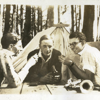 A photograph of three Pacific University students sitting at a picnic table in a campground. They were probably at an Epworth League camping trip. The Epworth League was founded by Methodists in 1889 for young adults ages 18-35. Activities often included camping. There were several campgrounds in Oregon and Washington for different chapters of the Epworth League to enjoy. This photograph appears in an album that was compiled by Edith Hansen McGill, a 1930 Pacific University graduate.