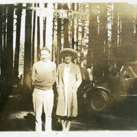 A photograph of two Pacific University students wearing hats while camping. The male appears to be wearing a freshman beanie, while the female appears to be wearing the senior sombrero. This was most likely taken during an Epworth League camping trip. The Epworth League was founded by Methodists in 1889 for young adults ages 18-35. Activities often included camping. There were several campgrounds in Oregon and Washington for different chapters of the Epworth League to enjoy. This photograph appears in an album that was compiled by Edith Hansen McGill, a 1930 Pacific University graduate.
