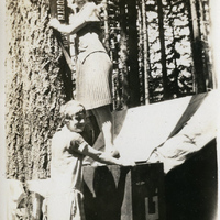 A photograph of two female Pacific University students hanging an Epworth League flag on a tree. This was most likely taken while camping with the Epworth League. The Epworth League was founded by Methodists in 1889 for young adults ages 18-35. Activities often included camping. There were several campgrounds in Oregon and Washington for different chapters of the Epworth League to enjoy. This photograph appears in an album that was compiled by Edith Hansen McGill, a 1930 Pacific University graduate.