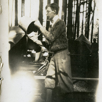 A photograph of a male Pacific University student dumping out a bucket while camping. Several tents are visible in the background. This was most likely taken during an Epworth League. The Epworth League was founded by Methodists in 1889 for young adults ages 18-35. Activities often included camping. There were several campgrounds in Oregon and Washington for different chapters of the Epworth League to enjoy. This photograph appears in an album that was compiled by Edith Hansen McGill, a 1930 Pacific University graduate.