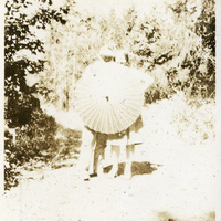- A photograph of two Pacific University students hiding behind an open parasol. This photograph appears in an album that was compiled by Edith Hansen McGill, a 1930 Pacific University graduate.