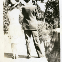 A photograph of Pacific University professor, Arthur J. Yeomans, with a student. The student is wearing the senior sombrero. They are standing next to an unidentified body of water. Professor Yeomans was the Professor of Education and Psychology at Pacific University during this time. This photograph appears in an album that was compiled by Edith Hansen McGill, a 1930 Pacific University graduate.