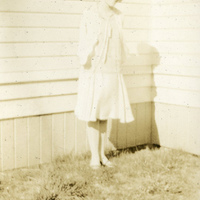 - A photograph of a female Pacific University student standing next to an unidentified building. This photograph appears in an album that was compiled by Edith Hansen McGill, a 1930 Pacific University graduate.