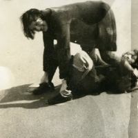 - A photograph of two female Pacific University students holding each other's ankles. They appear to be playing a game of some sort. This photograph appears in an album that was compiled by Edith Hansen McGill, a 1930 Pacific University graduate.