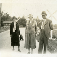 - A photograph of three people standing on a road in front of a railroad crossing. This photograph appears in an album that was compiled by Edith Hansen McGill, a 1930 Pacific University graduate.