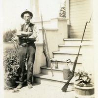 - A photograph of a man standing next to a porch with two rifles propped up next to him. One of the rifles has a bayonet attached to it. This photograph appears in an album that was compiled by Edith Hansen McGill, a 1930 Pacific University graduate.