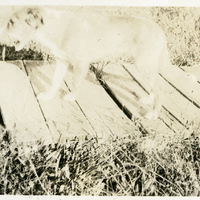 - A photograph of a dog walking on a wood plank walkway. This photograph appears in an album that was compiled by Edith Hansen McGill, a 1930 Pacific University graduate.