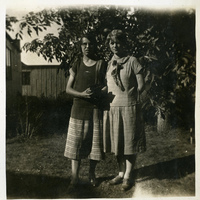 - A photograph of two young women or girls posing next to an unknown residence, possibly located in Forest Grove, Oregon. This photograph appears in an album that was compiled by Edith Hansen McGill, a 1930 Pacific University graduate.