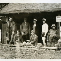 A photograph of a group of Pacific University students posing on the front porch of a cabin. Edith Hansen McGill, from the Pacific University Class of 1930, is wearing a white sweater and shorts. Her father, Harald J. Hansen, is on the left with his dog. They were probably at the Bay View Auto Camp in Netarts, Oregon. This photograph appears in an album that was compiled by Edith Hansen McGill, a 1930 Pacific University graduate.