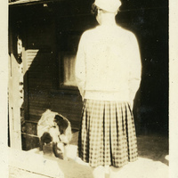 A photograph of a female Pacific University student and a dog in front of a cabin. The student is wearing a sailor hat and has her back to the camera. This was most likely taken at the Bay View Auto Camp in Netarts, Oregon. This photograph appears in an album that was compiled by Edith Hansen McGill, a 1930 Pacific University graduate.