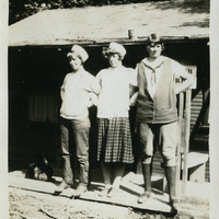 A photograph of Edith Hansen McGill with fellow Pacific University students. They are standing in front of a cabin that was most likely a part of the Bay View Auto Camp in Netarts, Oregon. This photograph appears in an album that was compiled by Edith Hansen McGill, a 1930 Pacific University graduate.