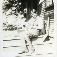 A photograph of a female Pacific University student with a dog. The pair are sitting on the porch of a cabin. This was most likely taken at the Bay View Auto Camp in Netarts, Oregon. This photograph appears in an album that was compiled by Edith Hansen McGill, a 1930 Pacific University graduate.