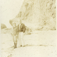 - A photograph of a couple standing on the beach near Netarts, Oregon. There is a large rocky hill behind them. This photograph appears in an album that was compiled by Edith Hansen McGill, a 1930 Pacific University graduate.