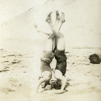 - A photograph of two Pacific University students doing a headstand back to back. They appear to be on the sand. The picture was most likely taken near Netarts, Oregon. This photograph appears in an album that was compiled by Edith Hansen McGill, a 1930 Pacific University graduate.