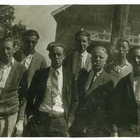 A photograph of a group of male Pacific University students outside of McCormick Hall. Several of them are smoking cigarettes. McCormick Hall was built in 1924 and is the oldest dormitory still on campus today. The original design included a kitchen, dining hall and a bowling alley in the basement. This photograph appears in an album that was compiled by Edith Hansen McGill, a 1930 Pacific University graduate.